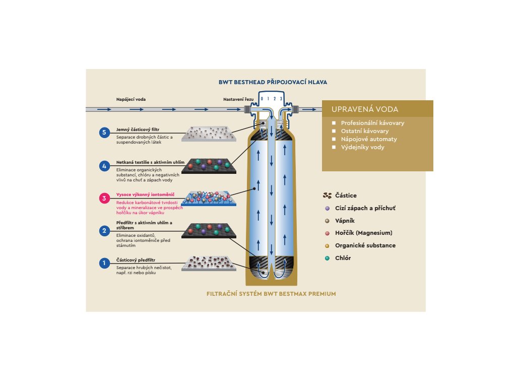 BWT Bestmax Premium využívá pětistupňový filtrační proces, jehož srdcem je speciální iontoměnič s technologií Magnesium Mineralized Water. V této fázi dochází k výměně iontů vápníku (který způsobuje tvrdost) za ionty hořčíku (Mg2+). Hořčík je v potravinářství známý jako nositel chuti – dokáže zvýraznit jemné nuance v kávě a čaji, které by v příliš měkké nebo naopak tvrdé vodě zanikly. Filtr samozřejmě obsahuje i aktivní uhlí pro odstranění chlóru a organických nečistot. Díky tomu získáváte vodu, která je technicky šetrná k vašemu kávovaru, ale senzoricky dokonalá pro extrakci.